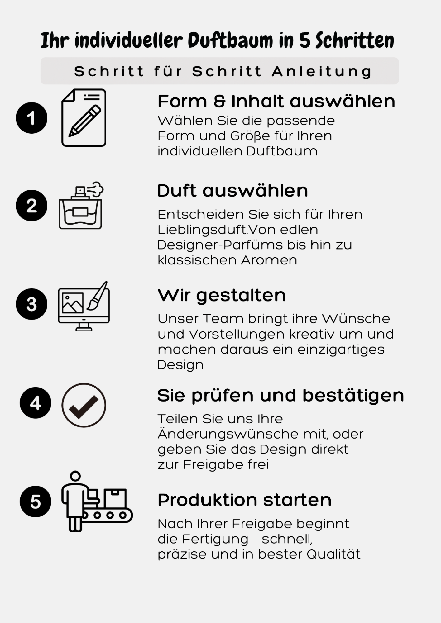 Gestalten Sie Ihren Duftbaum ganz nach Ihren Wünschen! Wählen Sie Ihren Lieblingsduft und kombinieren Sie ihn mit einem persönlichen Design – sei es ein Foto, ein Spruch oder ein eigenes Logo. So wird jeder Duftbaum zu einem einzigartigen Einzelstück, das nicht nur gut riecht, sondern auch Ihre Persönlichkeit widerspiegelt. Perfekt für Ihr Auto, Zuhause oder als individuelles Geschenk für Freunde und Familie.